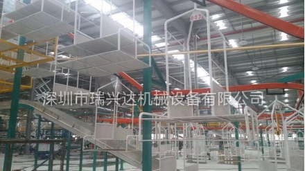 7、悬挂链输送设备可以使工件连续不断运经高温烘道、有毒气体区、喷粉室、冷冻区等人工不适应的区域,完成人工难以操作的生产工序,达到改善工人劳动条件、确保安全的目的。