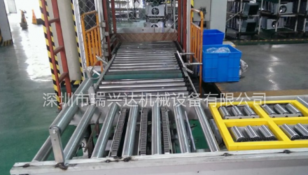 动力及无动力辊道线:采用铝合金边框结构,辊筒表面镀硬铬,以保证耐磨要求。辊筒采用直径为60mm的冷轧无缝钢管,中心距为120mm,支脚间距为1.4米。动力辊道输送机采用短节距p=12.7mm的精密滚子链,辊道上沿较边框高出10mm,使输送平稳可靠,调速动力辊道输送机采用变频调速器控制速度,以实现快速、准确变速。支撑采用钢结构支撑,表面镀锌,其它附件表面采用镀锌或发黑处理。整机具有美观大方,轻巧灵活,安装维修方便等特点。