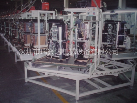 电冰箱组装生产线由链条牵引,承重的钢板、塑胶板等固定于输送机两侧导轨内的链条上,作为承重机构。